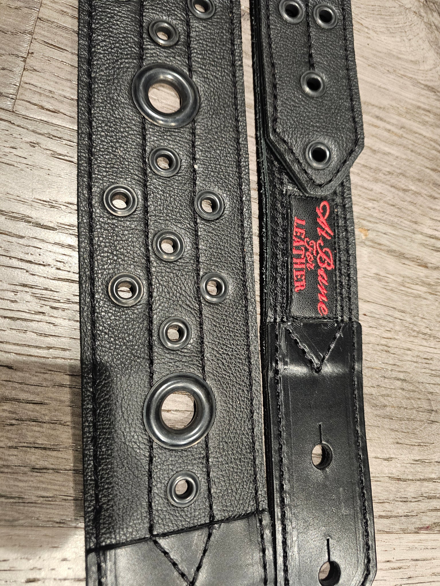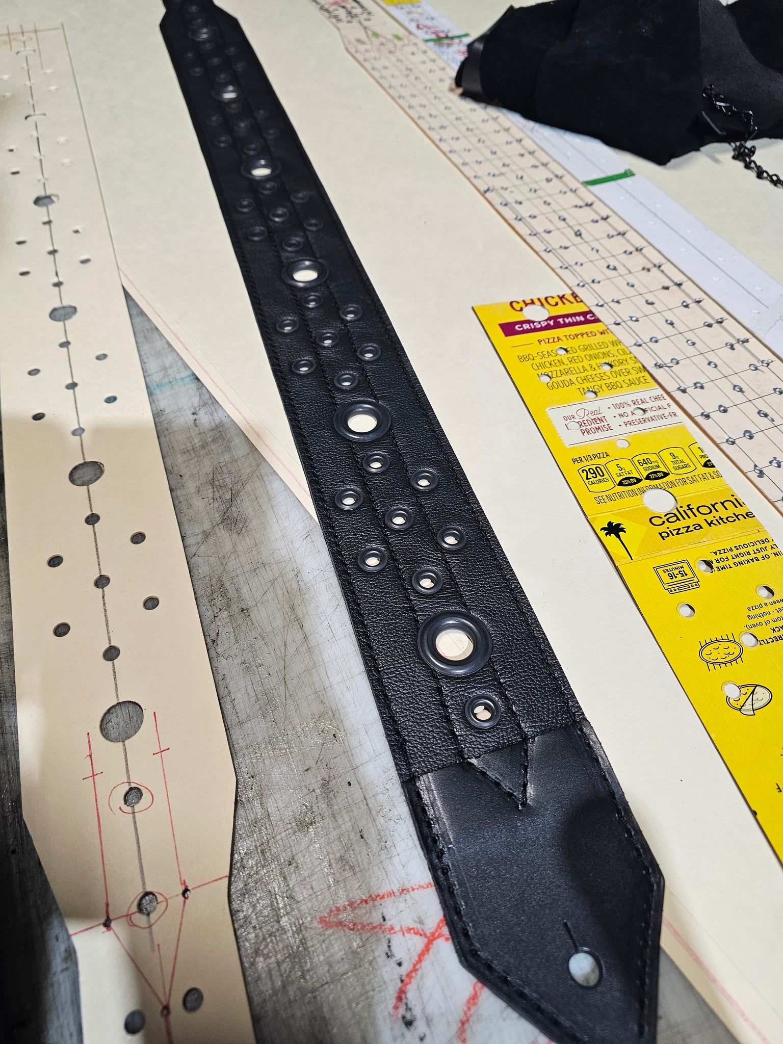 All of our guitar straps are adjustable from 50 to 61 in using a heavy duty harness buckle. Our straps are made of a composite of garment leathers with heavy duty mounting points on the ends.